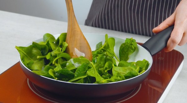 - Faites revenir les oignons et l'ail avec un peu d'huile dans une poêle. Ajoutez ensuite les épinards et assaisonnez de sel et de poivre.
