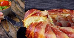 - Dans un moule à savarin, disposez le jambon cru sur le fond. Attention à l’orientation des tranches: une tranche doit couvrir le bord intérieur, le fond et le bord externe du moule.