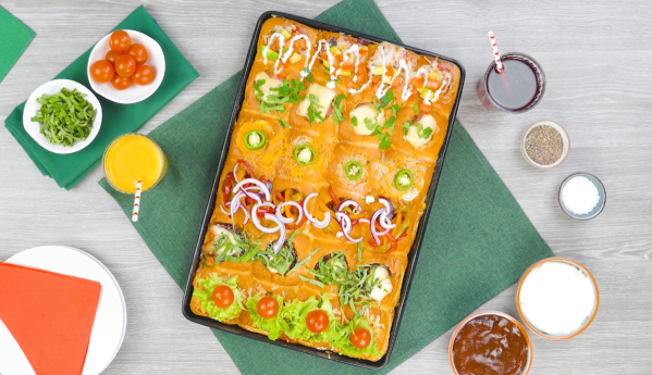 - Remplissez la première rangée avec des boulettes de viande, de la sauce tomate et du parmesan. La suivante avec du poulet, de la sauce BBQ et une boule de mozzarella. Suivi par le bœuf, la sauce piquante et les poivrons grillés. Continuez avec le fromage frais, le jalapeño, le cheddar râpé et la chapelure. Avec l'escalope, le jambon cuit et l'edam. Et enfin avec le mélange de viande hachée façon chili, la sauce salsa et la mozzarella râpée. Remettez la plaque au four pour 15 minutes supplémentaires à 180 °C.