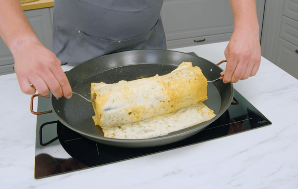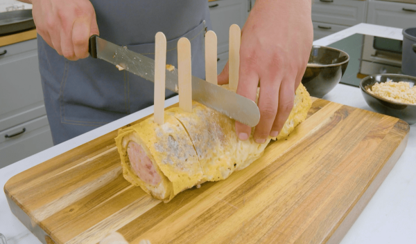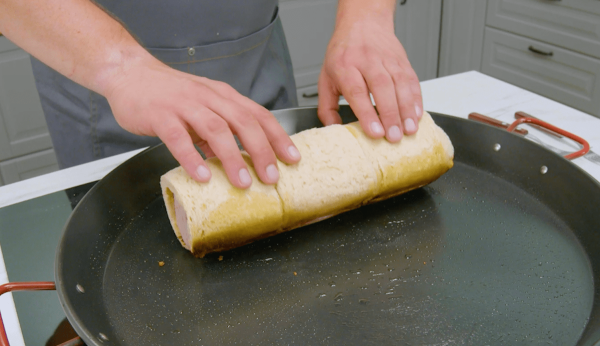 - Mettez 5 tranches de fromage dans la poêle et utilisez-les pour enrouler le rouleau de pain et de saucisse. Introduisez une fourchette dans chaque extrémité du rouleau afin de pouvoir le déplacer facilement. Retirez le rouleau de la poêle et laissez-le refroidir pendant environ 15 minutes.