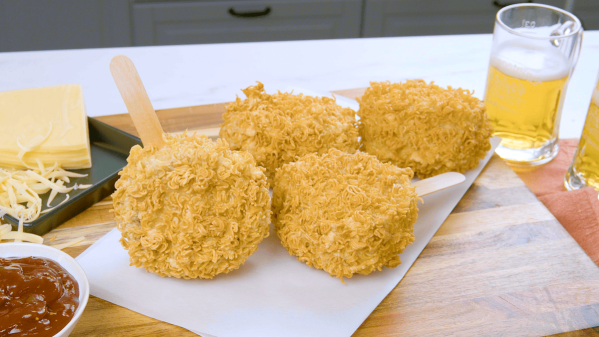 Aujourd’hui, nous vous proposons une nouvelle idée créative de snack qui a suscité l’enthousiasme dans notre cuisine : des sucettes salées ! Cet en-cas croustillant à base de saucisse a tout pour plaire et séduit par ses ingrédients parfaitement harmonisés. Le pain blanc rencontre le beurre aux herbes, le bacon, la saucisse de viande et le fromage. Pour finir, la sucette est frite. Un en-cas original qui va vous en mettre plein la vue (et les papilles). C’est parti !