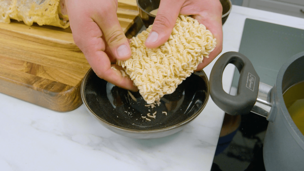- Pour la pâte à frire, mettez tous les ingrédients dans un saladier et mélangez-les à l'aide d'un fouet pour obtenir une pâte lisse. Laissez la pâte gonfler quelques instants, puis mélangez-la à nouveau. Hachez ensuite les nouilles Ramen et mettez-les dans un bol.