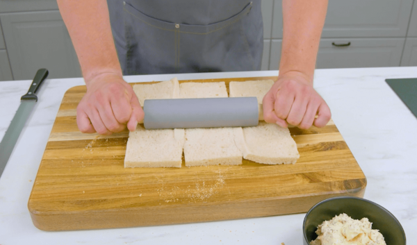 - Coupez le pain blanc dans le sens de la longueur en trois tranches d'environ 1 cm de large. Retirez la croûte du pain, placez les trois tranches sur la planche en les faisant se chevaucher légèrement et aplatissez-les avec un rouleau à pâtisserie.