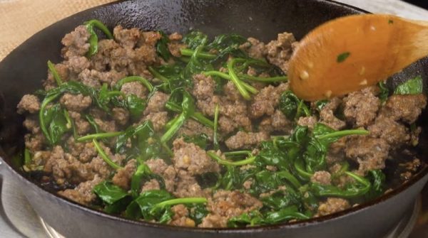 - Faites revenir la viande hachée dans l'huile végétale. Ajoutez l'ail dans la poêle et faites revenir brièvement avant d'ajouter les épinards frais.