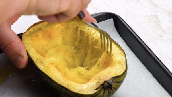- Laissez refroidir brièvement les moitiés de citrouille. Passez ensuite une fourchette à travers la chair pour former des spaghetti.