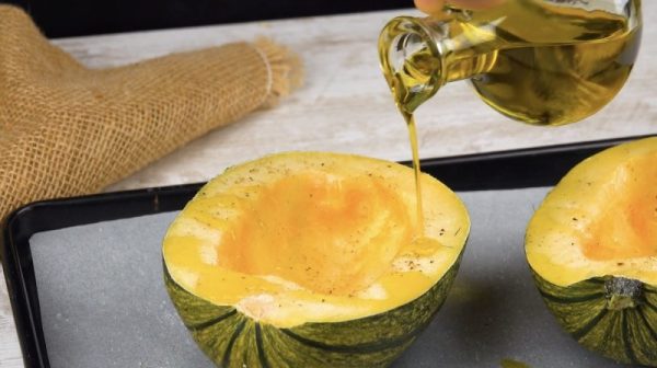 - Coupez la citrouille en deux et enlevez les graines. Salez et poivrez les deux moitiés. Versez ensuite une cuillère à soupe d'huile d'olive dans chaque moitié et enfournez-les à 200 °C pendant 35 minutes, à chaleur tournante.Conseil : chauffez les moitiés de citrouille au micro-ondes pendant trois minutes avant de les préparer pour qu'elles deviennent bien molles. Il est ainsi plus facile d'enlever les graines.