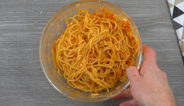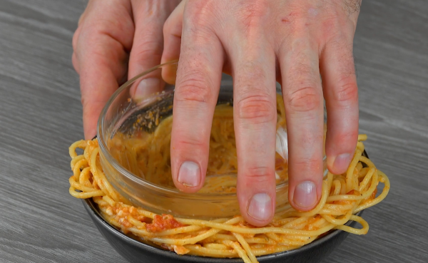 • Mettez les spaghettis dans un bol ignifuge, puis formez un creux dans un saladier plus petit. Placez le bol ignifuge avec les spaghettis (mais sans le petit bol) dans le four à 160 °C pendant 20 minutes, à chaleur tournante.