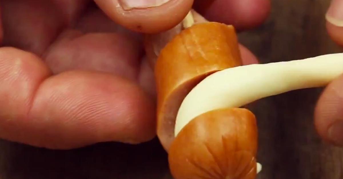 - Plantez en biais un couteau sur le bas de la saucisse. Faites tourner la brochette avec le couteau toujours dedans, pour avoir une incision jusqu’au haut de la saucisse. Vous devriez vous retrouver avec une saucisse en spirale.