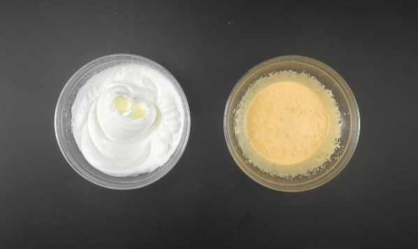 - Ajoutez 160 g de sucre aux blancs d'œufs et 80 g de sucre aux jaunes d'œufs. Battez les ingrédients dans les deux saladiers à l'aide d'un batteur électrique jusqu'à ce qu'ils soient bien fermes.