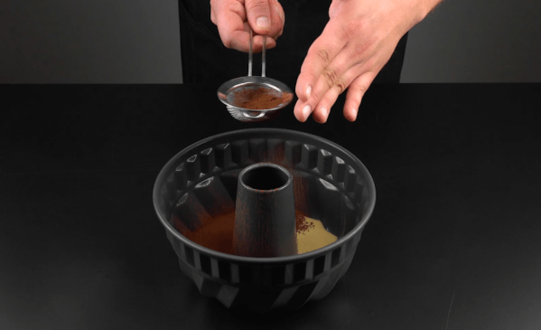 - Préchauffez le four à 180 °C, à chaleur tournante. Maintenant, commencez à verser la pâte dans le moule à savarin. Commencez avec environ la moitié de la pâte jaune. Ensuite, saupoudrez la pâte de cacao en poudre à l'aide d'un petit tamis.