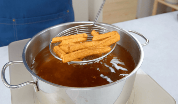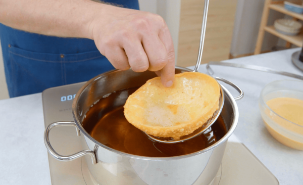 - Mélangez les œufs et le sel dans un saladier, ajoutez la farine et mélangez le tout pour obtenir une pâte lisse. Faites chauffer l'huile dans une casserole à 170 °C. Plongez ensuite brièvement la louche dans l'huile chaude, puis dans la pâte, de sorte que le côté extérieur de la louche soit recouvert de pâte. Plongez la louche une nouvelle fois dans l'huile chaude et faites frire la couche de pâte. Détachez ensuite la coquille de pâte ainsi obtenue de la louche, faites-la frire tranquillement encore une fois entièrement dans la graisse et laissez-la ensuite s'égoutter.