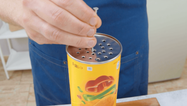 - À l'aide d'un clou et d'un marteau, faites plusieurs trous dans le fond de la boîte de chips. Versez les pommes de terre cuites et encore chaudes dans la boîte de chips. Enfoncez ensuite la bouteille dans la boîte par le haut, de manière à pouvoir former des fils de pommes de terre qui tomberont dans l'hémisphère en pâte frite.