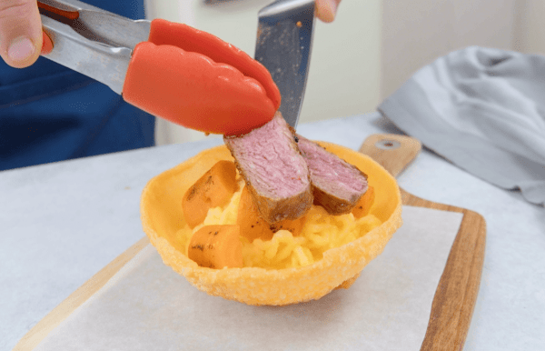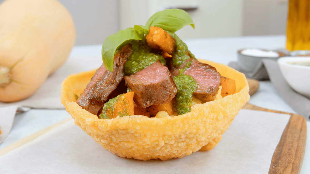 Cette recette montre qu’il n’y a pas de limites à la créativité, même dans le domaine culinaire. Aujourd’hui, nous servons un steak avec des pommes de terre dans une coque en pâte frite comestible. Le tout est accompagné de carottes caramélisées, de frites de citrouille et de pesto au basilic. Non seulement cela a l’air particulièrement cool, mais la combinaison est également délicieuse. On vous montre :