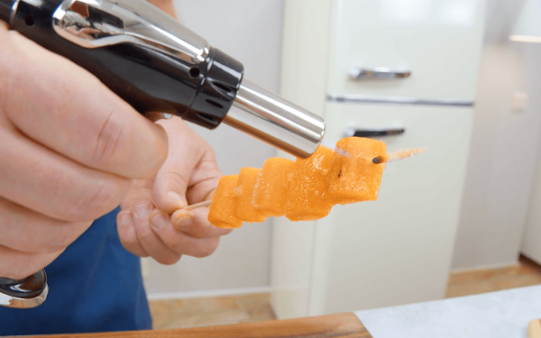 - Piquez les carottes cuites et encore chaudes sur une brochette en bois, roulez-les dans du sucre et caramélisez-les avec un chalumeau. Retirez ensuite les carottes de la brochette et posez-les sur la masse de pommes de terre dans l'hémisphère en pâte.