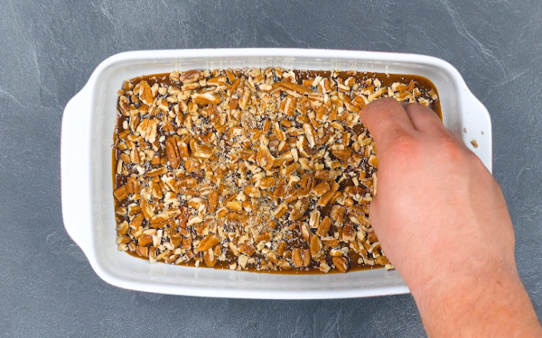 - Mettez le beurre, le sucre et le miel dans une casserole et faites bouillir le tout. Versez le caramel liquide dans une casserole et parsemez-le entièrement de noix de pécan hachées.
