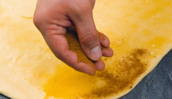 - Une fois la pâte levée, étalez-la sur un plan de travail enfariné jusqu'à ce qu'elle atteigne environ 35 x 40 cm. Tartinez-la de beurre fondu et saupoudrez d'un mélange de sucre, de cannelle et de noix de muscade.