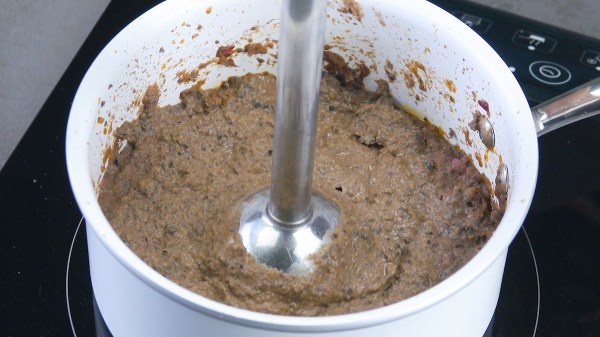- Faites chauffer l'huile dans une poêle et faites suer les oignons et l'ail jusqu'à ce qu'ils deviennent translucides. Ajoutez les autres ingrédients, laissez mijoter brièvement et réduisez le tout en purée.