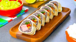 - Faites frire les tortillas enroulées dans une poêle jusqu'à ce qu'elles soient croustillantes et coupez-les en morceaux avant de les servir.