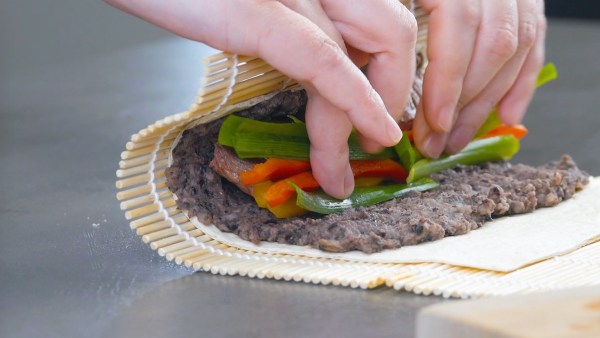 - Placez les tortillas l'une après l'autre sur une natte à sushi. Humidifiez d'abord chaque tortilla avec un peu d'eau, puis recouvrez-les de purée de haricots ; laissez un bord sur un côté pour faciliter l'enroulement. Ensuite, garnissez la purée de haricots d'une bande de rumsteck et de lanières de poivron et d'oignon nouveau. Puis enroulez la tortilla.Conseil : pour une meilleure prise en main, badigeonnez le bord de la tortilla avec un peu d'eau ou de blanc d'œuf avant de l'enrouler.