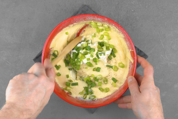 - Mélangez la farine avec la levure chimique. Battez d'abord les œufs et le beurre puis incorporez l'huile et le lait. Ajoutez la crème fraîche, les oignons nouveaux coupés, le sucre, le sel et le poivre et mélangez le tout.