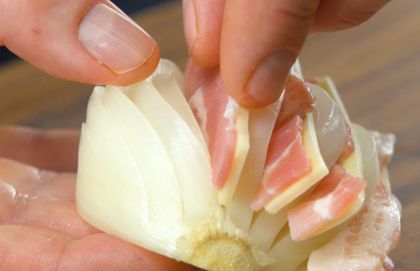 - Retirez les moitiés d'oignon de la poêle et laissez-les refroidir brièvement. Ensuite, remplissez les incisions avec des tranches de lard et de fromage.