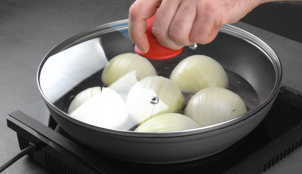- Coupez d'abord 3 oignons en deux dans le sens de la longueur sur la tige et le bout. Ne coupez pas les extrémités, car elles maintiennent l'oignon ensemble. Enlevez la pelure des moitiés d'oignon et coupez-les en éventail assez profondément, mais pas entièrement. Placez les moitiés d'oignon dans une casserole avec la surface coupée vers le bas. Versez le bouillon de légumes dessus, ajoutez le cumin et laissez cuire dans la poêle avec le couvercle fermé pendant environ 15 minutes.