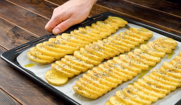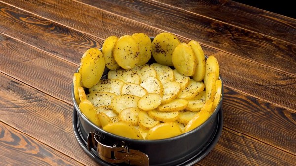 - Graissez le moule à charnière avec du beurre et déposez les tranches de pommes de terre dans le fond et sur les bords de celui-ci.