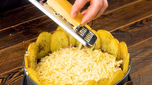 - Déposez 3 tranches de jambon blanc sur les pommes de terre et râpez le fromage par-dessus.