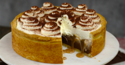 - Une fois ce temps imparti, versez la sauce caramel sur le chocolat. Battez les 700 ml de crème liquide avec un peu de sucre glace (ou utilisez de la chantilly déjà toute faite) et recouvrez le caramel avec la moitié.