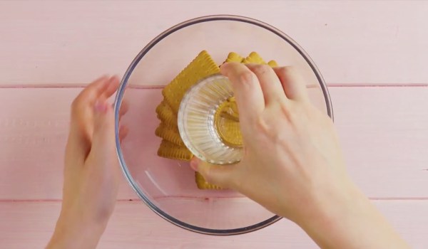 - Placez les Petit Beurre dans un saladier et écrasez-les en miettes avec un verre. Mettez de côté quelques cuillères à soupe de miettes et mélangez le beurre fondu dans le reste.
