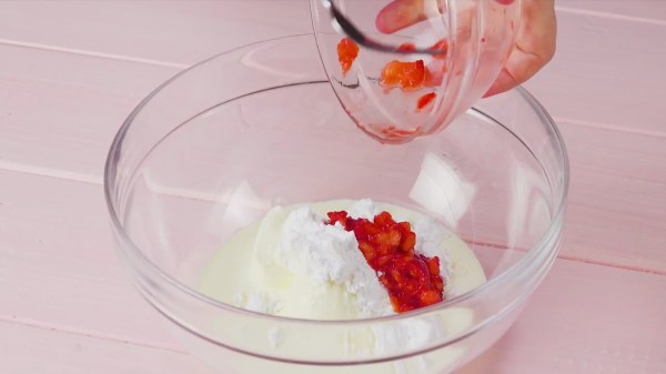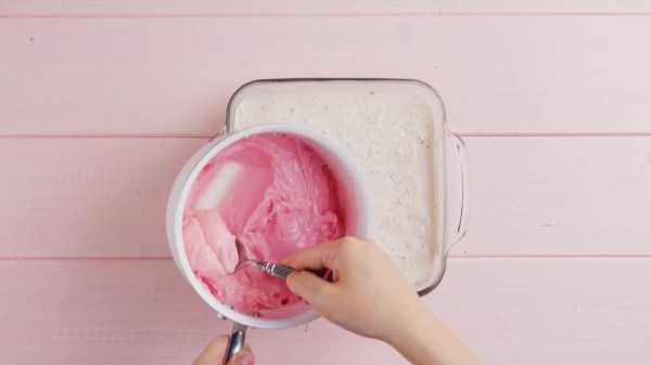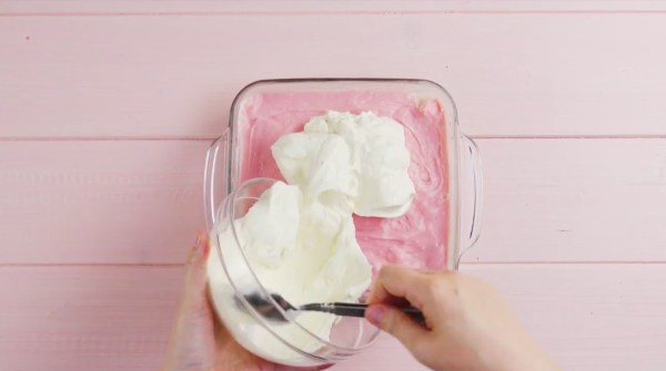 - Étalez ensuite la pâte crémeuse à la fraise par-dessus et remettez le saladier au frais.