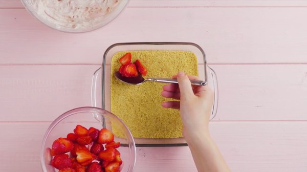 - Coupez les fraises restantes et répartissez-les uniformément sur la couche de Petit Beurre.