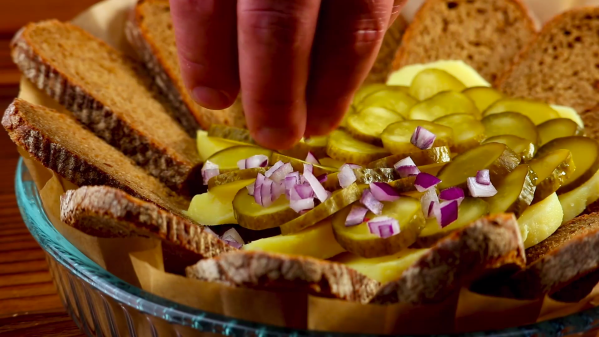 - Après avoir ajouté les tranches de cornichons aigres-doux sur les pommes de terre, saupoudrez le tout d’oignon rouge ciselé.