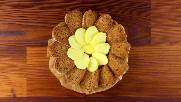- Déposez ensuite le papier cuisson dans le plat et, dans le fond de celui-ci, deux tranches de pain de campagne. Tout autour du plat, faites se chevaucher des demi tranches de pain. Ajoutez au centre les tranches de pommes de terre.