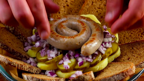 - Sur le lit de pommes de terre-oignon-cornichons, disposez les chipolatas enroulées sur elles-mêmes.