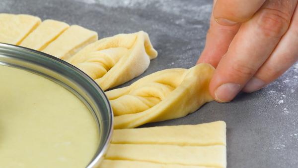 - Abaissez la pâte en cercle et placez un couvercle de casserole au milieu. Maintenant, coupez le bord tout autour jusqu'au couvercle, de façon à créer une sorte de soleil. Torsadez toujours trois des brins ensemble : tordez celui du milieu et pressez les deux sur les côtés ensemble comme sur la photo. Laissez la pâte lever pendant encore 15 minutes.