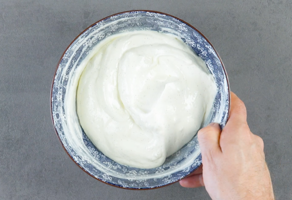 - Mettez le fromage frais, le yaourt, le blanc d'œuf, la farine d'amidon, la pulpe d'une gousse de vanille et le sirop de sucre dans un saladier et mélangez le tout.