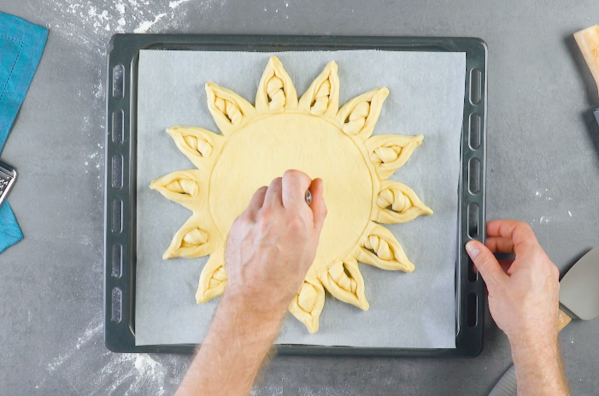 - Placez la fleur de pâte sur une plaque de pâtisserie recouverte de papier sulfurisé et piquez le cercle central à l'aide d'une fourchette.