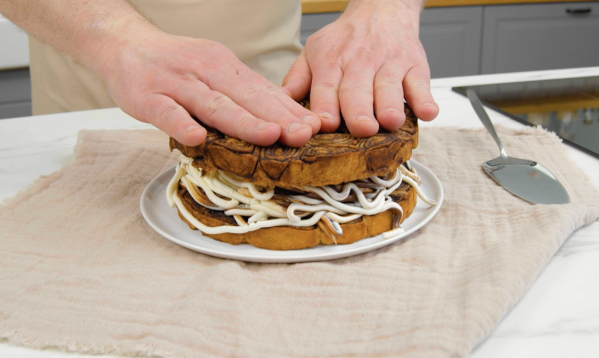 - Posez le premier fond de tarte cuit sur une assiette. Remplissez ensuite le presse-purée en alternant le fromage frais et la crème choco-noisettes et répartissez la masse uniformément sur le fond de tarte. Posez ensuite le deuxième fond de tarte par-dessus.