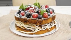 - Décorez le gâteau avec des baies, de la menthe fraîche et du sucre en poudre.