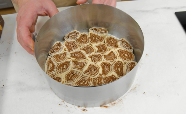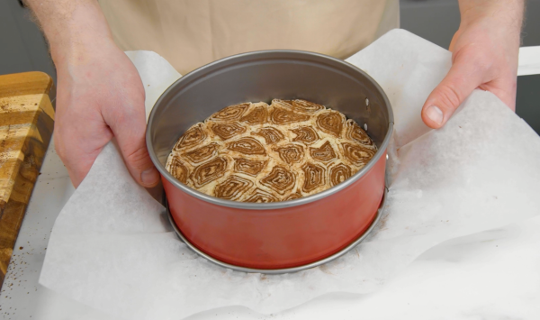 - Glissez le fond d'un moule à charnière sous le papier sulfurisé et tendez le cercle du moule à charnière tout autour. Répétez avec l'autre moitié des escargots de pâte. Enfournez les deux moules pendant 35 minutes à 175 °C, en mode convection. Laissez ensuite refroidir la pâte cuite pendant au moins 2 heures.
