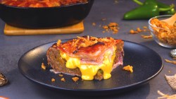 - Déposez 19 tranches de bacon dans le fond de la poêle. Posez la viande hachée par-dessus et pressez-la bien à plat avec les mains. Assaisonnez avec le mélange d'épices pour barbecue.