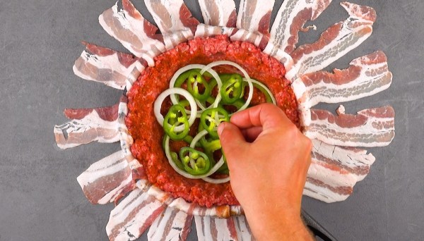- Coupez le poivron, l'oignon et le jalapeño en rondelles et déposez-les sur la viande hachée.