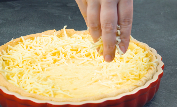 • Faites bouillir les pommes de terre puis écrasez-les (videz l'eau de cuisson avant). Ajoutez le lait, le beurre, la noix de muscade et le jaune d'œuf et mélangez le tout. Étalez la purée de pommes de terre sur la base de pâte précuite et refroidie. Lissez la purée et saupoudrez de fromage râpé.
