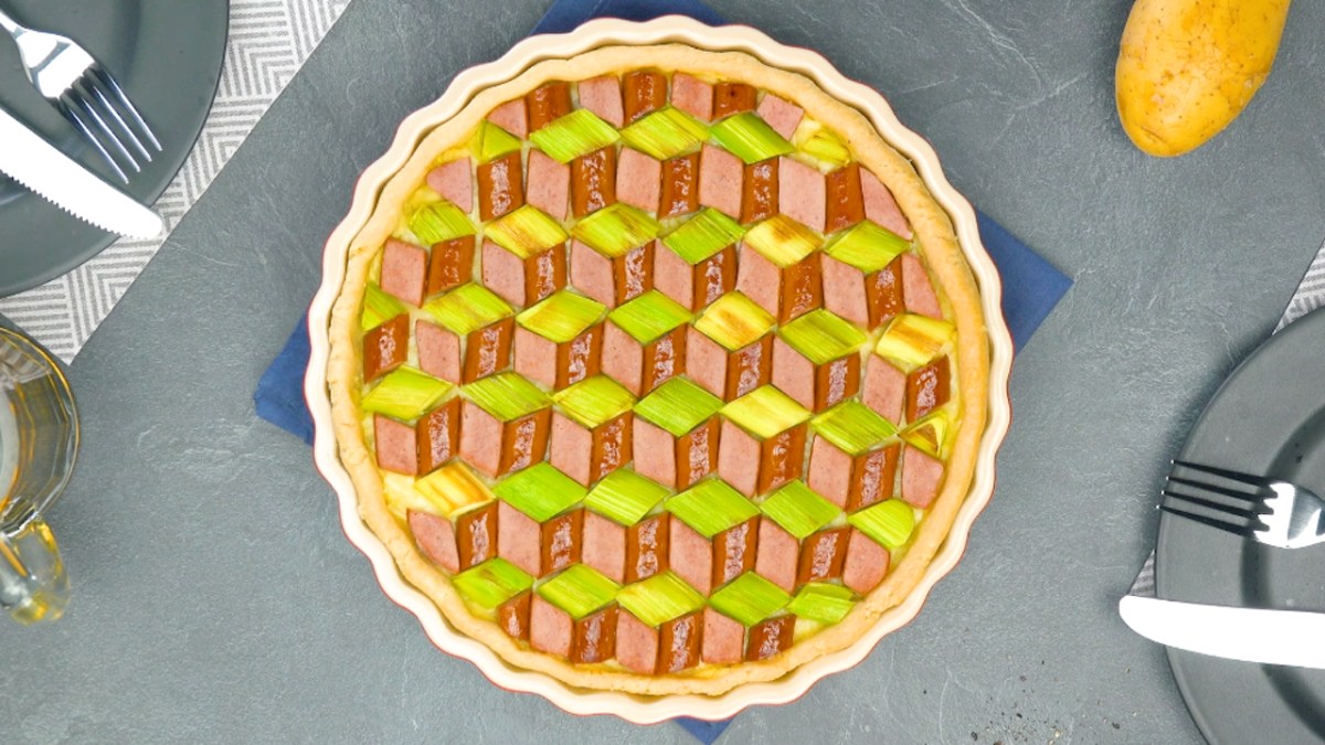 Vous cherchez une recette qui laissera une impression durable à vos convives ? Avec quelques astuces simples, la tarte salée suivante ressemble à une œuvre d’art géométrique. Coupez la saucisse de bœuf et le poireau en petits losanges et recouvrez la tarte avec. Utilisez une bonne portion de purée de pommes de terre pour compléter ce chef-d’œuvre culinaire.