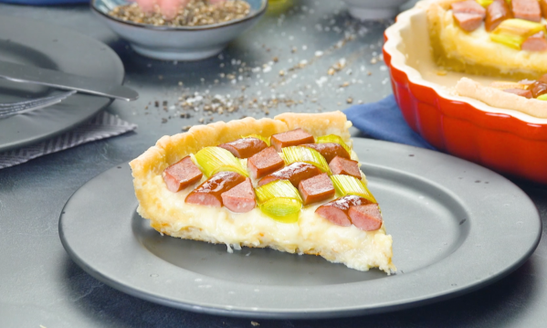 Tarte avec saucisse de bœuf, poireaux et purée de pommes de terre