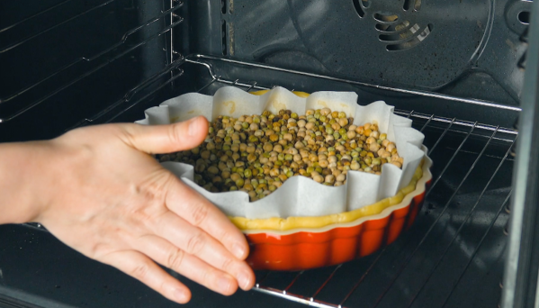 • Travaillez le beurre dans la farine avec une fourchette et ajoutez du sel. Ajoutez progressivement l'eau glacée et pétrissez. Formez une boule avec la pâte et mettez-la au frais pendant environ une heure. Recouvrez le moule à tarte de papier sulfurisé et déposez la pâte étalée dessus. Posez une autre couche de papier sulfurisé sur la pâte et alourdissez-la avec des haricots secs. Faites cuire la pâte pendant 20 minutes dans un four à 180 °C, en mode convection.