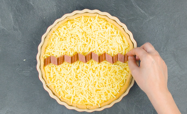 • Coupez les saucisses de bœuf en deux puis formez de petits losanges. Placez ces losanges en alternant le "côté pile" et le "côté face" sur le fromage. Coupez également les poireaux en petits losanges et déposez-les en une nouvelle rangée dans le moule en suivant les losanges de saucisses. Reproduisez les motifs géométriques de façon à recouvrir entièrement la tarte.