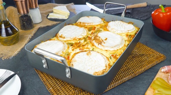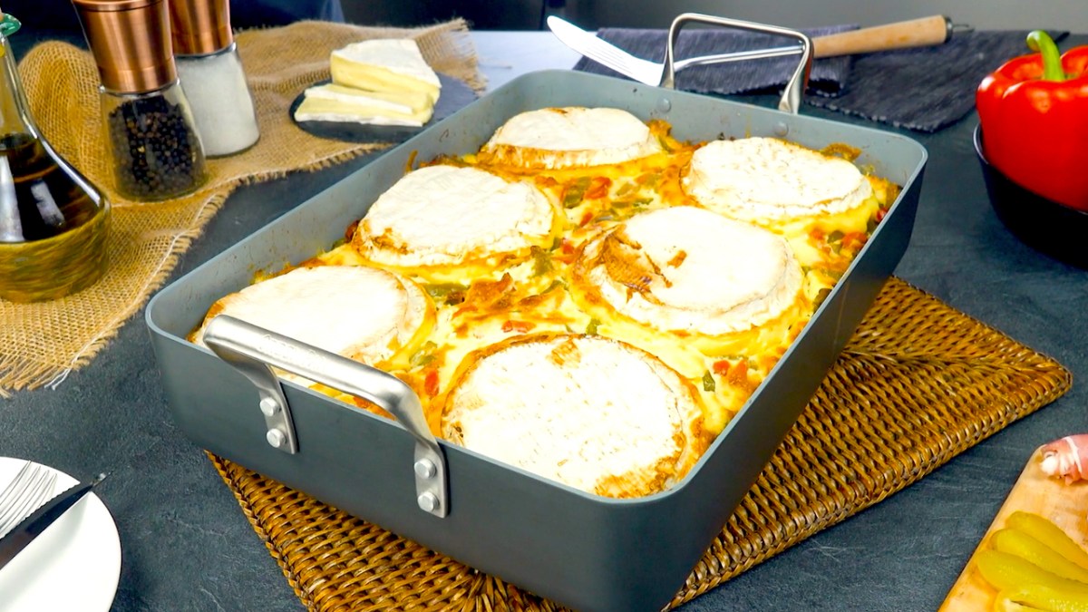 - Recouvrez les oignons et les poivrons d'une couche de crème fraîche. Coupez ensuite les camemberts en deux horizontalement et placez-les sur la crème fraîche avec la croûte du fromage vers le haut. Enfin, enfournez la tartiflette pendant 40 minutes à 160 °C.