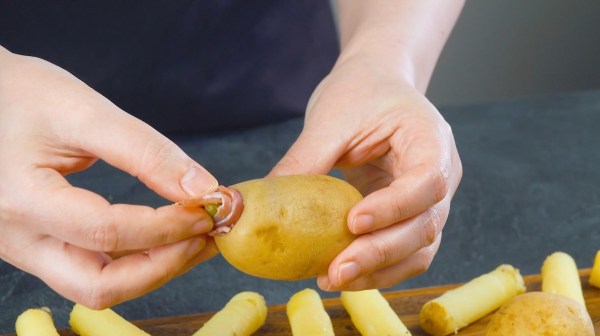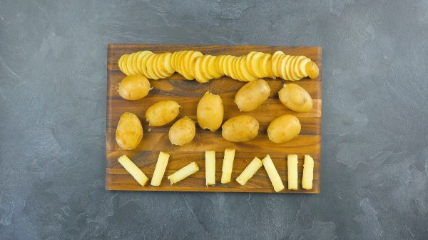 - Faites bouillir les pommes de terre dans de l'eau salée et laissez-les refroidir. Coupez cinq des pommes de terre en tranches. Épépinez les neuf pommes de terre restantes avec un vide-pomme et prenez l'intérieur des pommes de terre.